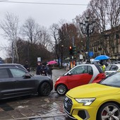 Scontro tra due auto alla Gran Madre: traffico in tilt, tram e bus deviati
