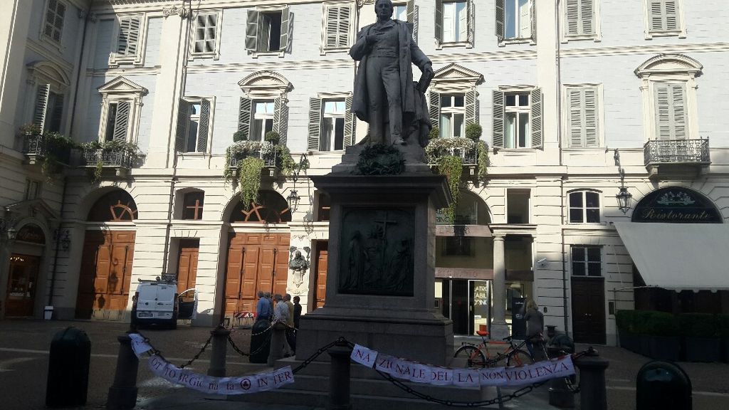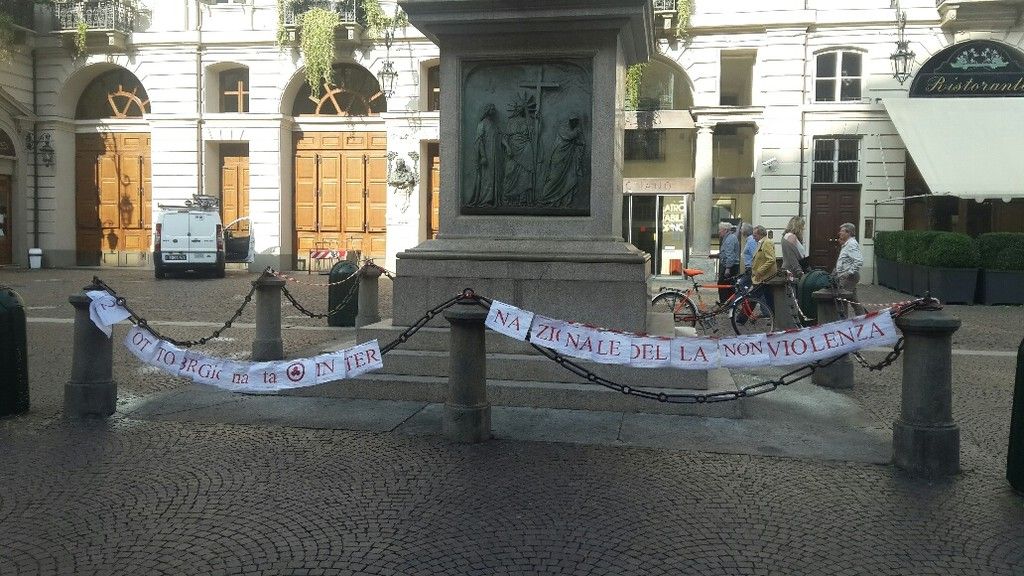 Sul cordolo di protezione del monumento a Vincenzo Gioberti, collocato al centro di piazza Carignano davanti all'omonimo teatro, è stato affisso lo striscione che recita "No alla violenza".
