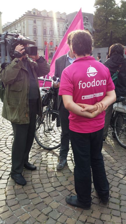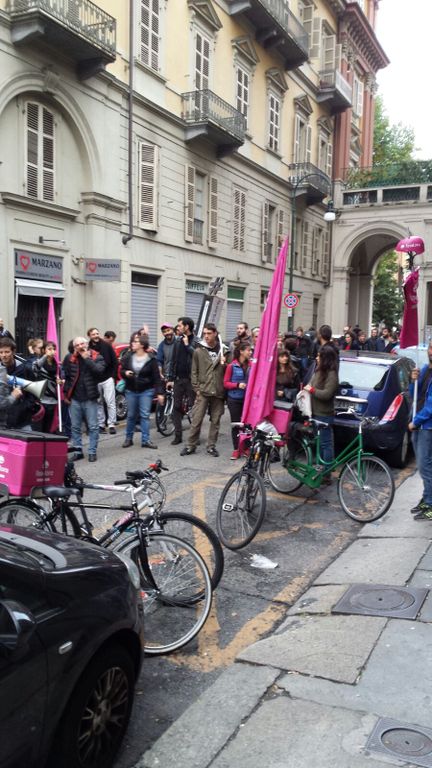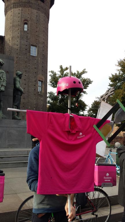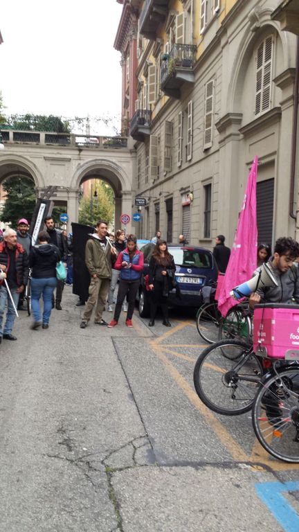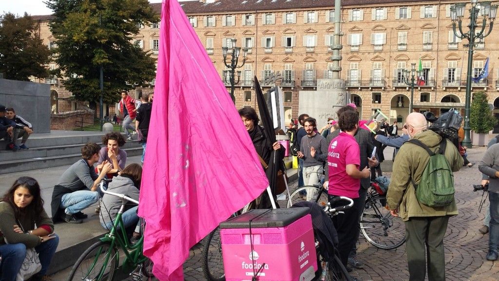 Non demordono i collaboratori Foodora, riuniti anche oggi in un presidio partito da piazza Castello e terminato nel tardo pomeriggio davanti alla sede rappresentativa dell'azienda, in via Carlo Allioni 3.