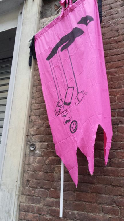 I dipendenti hanno attaccato volantini e striscioni davanti alle saracinesche chiuse, ribadendo con un megafono le richieste e il rifiuto di voler continuare a lavorare con un salario così basso e con un contratto co.co.co.