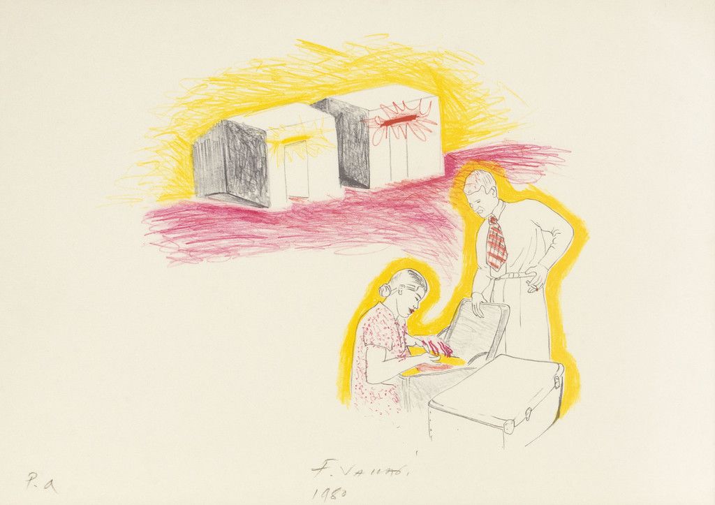 Franco Vaccari (Modena, 1936) negli anni Sessanta utilizza la fotografia per presentare i graffiti come poesia anonima, poesia trovata. Il tema della traccia e il mezzo fotografico sono due costanti che attraversano tutto il suo lavoro. Sin dall’inizio non usa la fotografia per produrre delle immagini mimetiche, ma come impronta di una presenza, come traccia fisica di un esserci. Emblematiche, a questo proposito, rimangono le sue numerose “esposizioni in tempo reale”. In mostra due litografie intitolate La coppia (1980), dove l’artista illustra graficamente il dualismo che governa la sua “Esposizione in tempo reale n. 18: Proposta per diurno”.