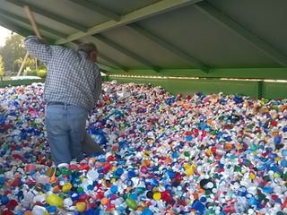 “Noi volontari,” dice Stefano Piva, “ci occupiamo di tenere in ordine l’area e di caricare i tappi nei container. Un container può contenere circa 3 tonnellate e mezzo di tappi e impiega di norma 3 mesi per riempirsi. Ogni tonnellata è pagata 200 euro da un’azienda che ricicla plastica per farne sedie, cassette per la verdura, pedane e altre cose.”