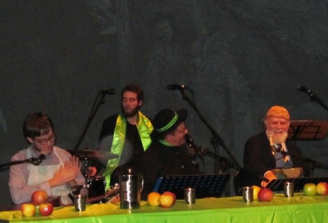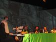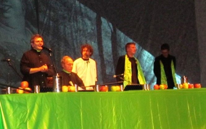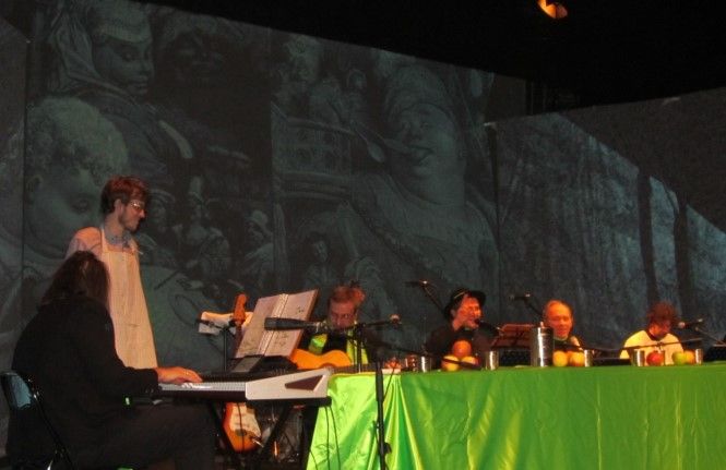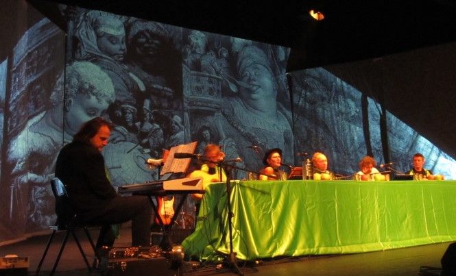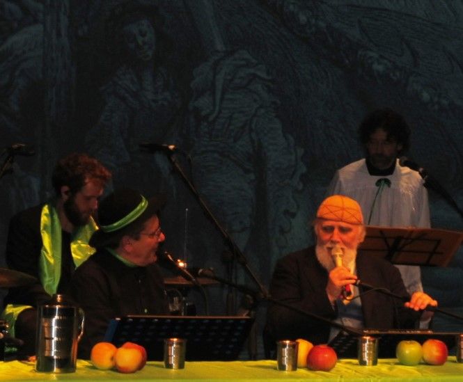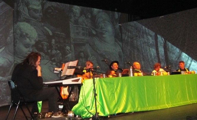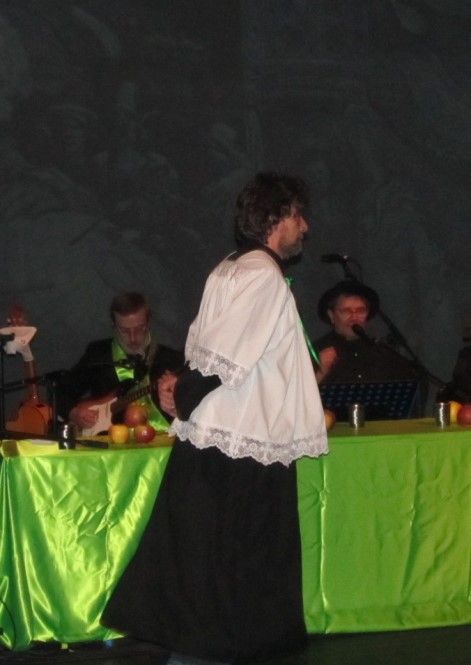 Sul palcoscenico attorno ad un tavolo elegantemente imbandito siedono gli attori e i musicisti coinvolgendo con simpatia il pubblico in momenti di grande convivialità e ospitando ogni sera personaggi diversi. Ho avuto la fortuna di assistere alla serata in cui è stato ospitato a tavola Moni Ovadia, che ha reso davvero straordinaria la serata. Accanto alle citazioni storiche e letterarie, che scorrono veloci alternando attimi di comicità e momenti di riflessione, con lo sfondo delle immagini di Gargantua e Pantagruel, c’è la musica sempre di grande qualità e ottima esecuzione proposta da Claudio Dadone e dall’orchestra Bluette. Le riflessioni di Moni Ovadia hanno aggiunto valore ad un progetto, già interessante, ricco di contenuti e di grande simpatia. La formula è quella classica del gruppo: padre Filip è un finto prete che racconta parabole comiche e canta canzoni. Lo spettacolo è in lingua italiana, ma ci sono anche parti in francese e in dialetto, che Padre Iork, traduce con lo stile del fine ed elegante dicitore, da segnalare la parodia di “O sole mio” dedicata alla fragola di Peveragno e la traduzione in dialetto piemontese di “Bella senz’anima” di Riccardo Cocciante. In grande forma anche Luca , l’inseparabile “chierichetto”, pronto ad assecondare padre Filip in ogni sua esigenza. Nello spettacolo gli elementi classici del trio, sono una garanzia per il pubblico di sorrisi, risate e allegria.