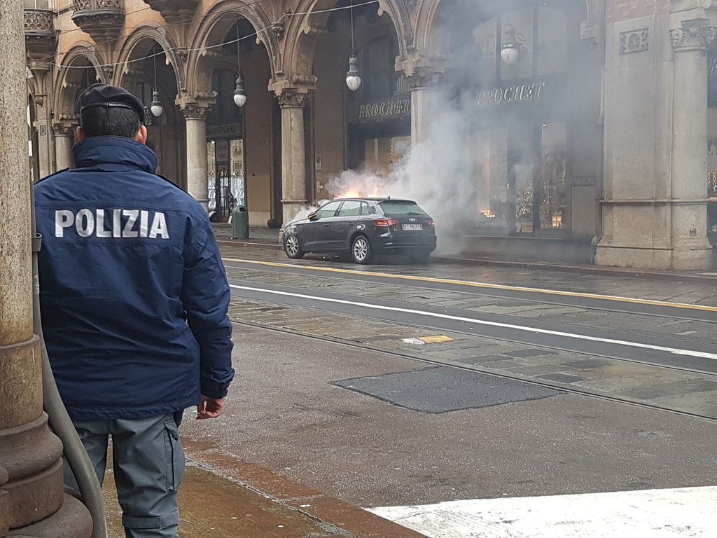 In pochi minuti l'auto, un'Audi A3 nera, è stata avvolta dalle fiamme e dal fumo, che poi si è diramato nelle vie attigue