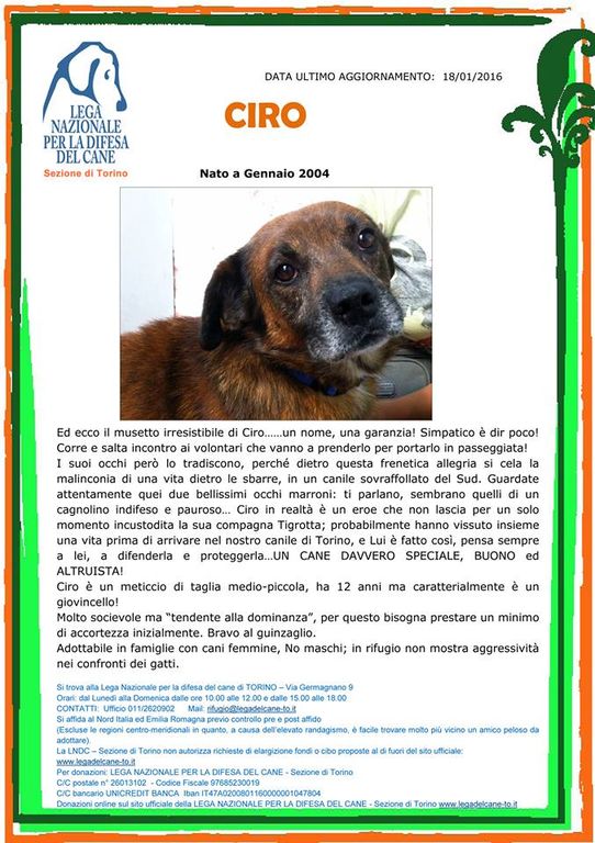 Ciro è un meticcio di taglia medio-piccola, ha 12 anni ma caratterialmente è un giovincello! Molto socievole ma “tendente alla dominanza”, per questo bisogna prestare un minimo di accortezza inizialmente. Bravo al guinzaglio. Adottabile in famiglie con cani femmine, No maschi; in rifugio non mostra aggressività nei confronti dei gatti. Si trova alla Lega Nazionale per la difesa del cane di TORINO – Via Germagnano 9 Orari: dal Lunedì alla Domenica dalle 10 alle 12 e dalle 15 alle 18. CONTATTI: Ufficio 011/2620902 Mail: rifugio@legadelcane-to.it