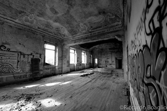 Tra i luoghi documentati, c’è la settecentesca Villa Moglia a Chieri. Dapprima dimora di marchesi e poi Istituto Salesiano, finisce per diventare di proprietà comunale e di essere abbandonata al suo destino. Oggi, come si vede dalle foto di Riccardo, le stanze mantengono ancora qualche segno di quella bellezza che doveva averla caratterizzata un tempo ma per lo più sono un insieme di calcinacci e macerie. Con una certa frequenza, l’edificio è teatro di riti satanici, goliardate e fa a volte da sfondo a cortometraggi horror girati da troupe di ragazzi.