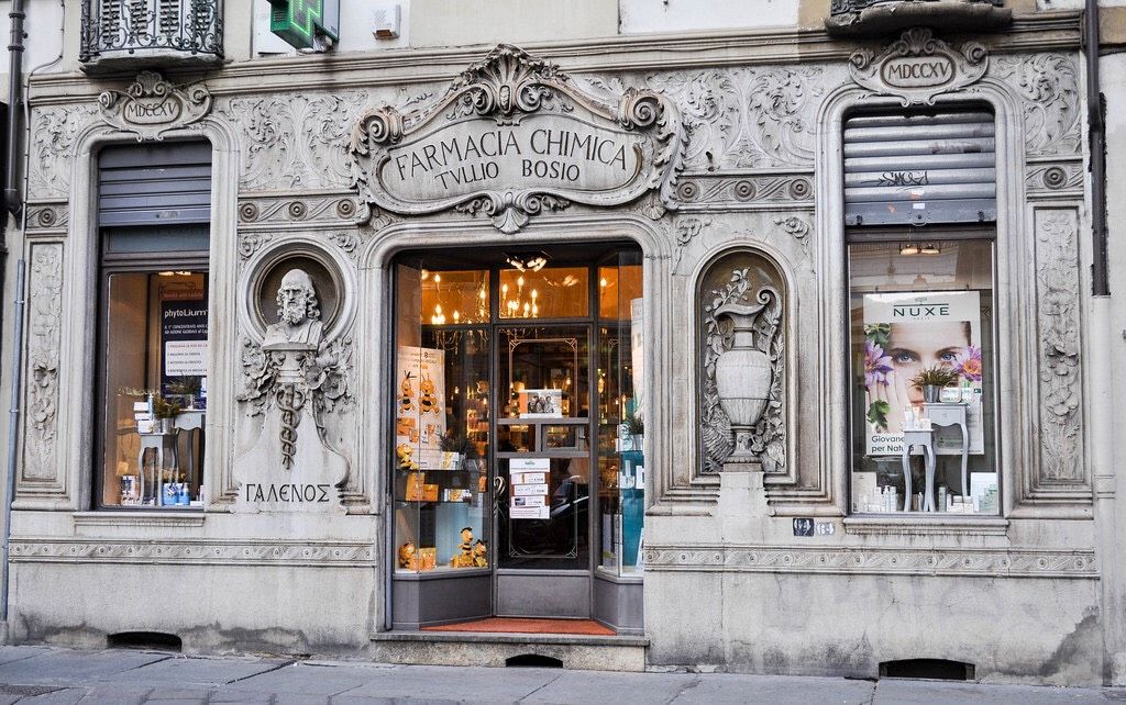 La farmacia chimica Tullio Bosio, fondata nel 1715, una fra le più antiche farmacie di Torino, risplende con la sua maestosa facciata fra i vari negozi di via Garibaldi.