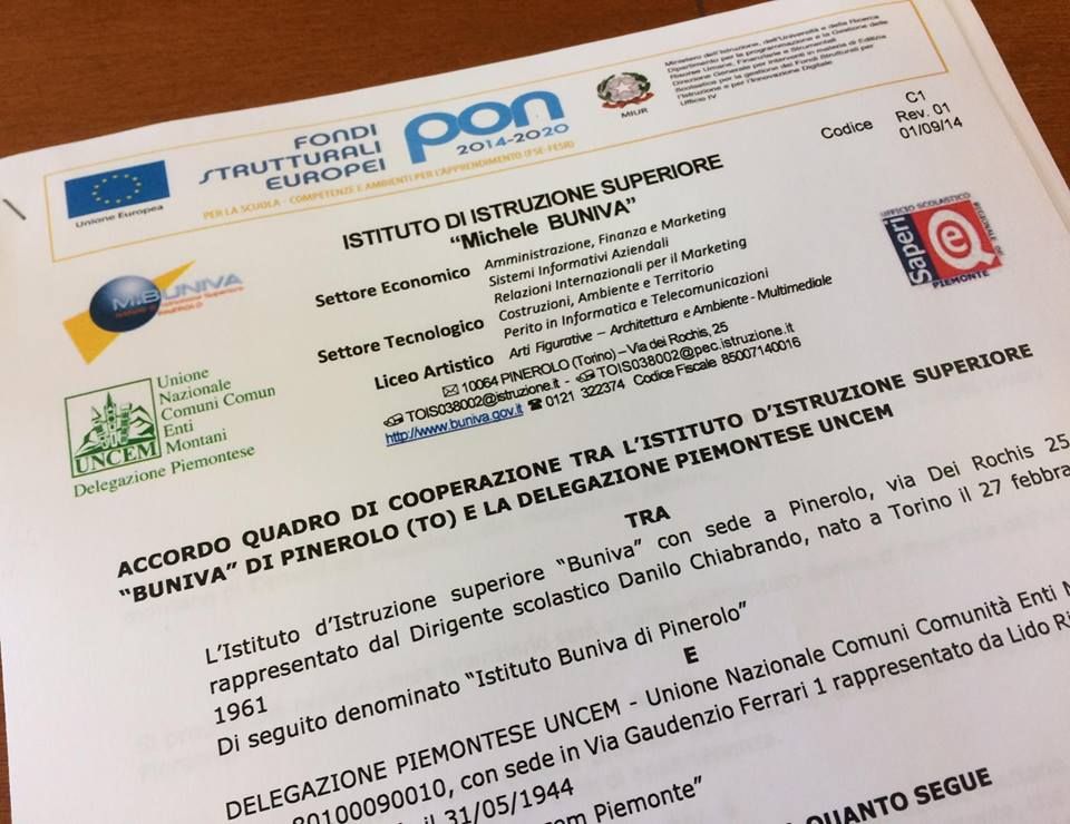 L'Uncem e l'istituto d'istruzione superiore Buniva di Pinerolo hanno sottoscritto un protocollo d'intesa per aumentare le opportunità formative e favorire, nelle aree montane, l'alternanza scuola-lavoro, con appositi progetti che verranno costruiti nei prossimi anni scolastici per i corsi dei settori tecnologico, artistico, economico. A firmare l'accordo sono stati il Dirigente scolastico del Buniva Danilo Chiabrando e Lido Riba, presidente Uncem Piemonte.