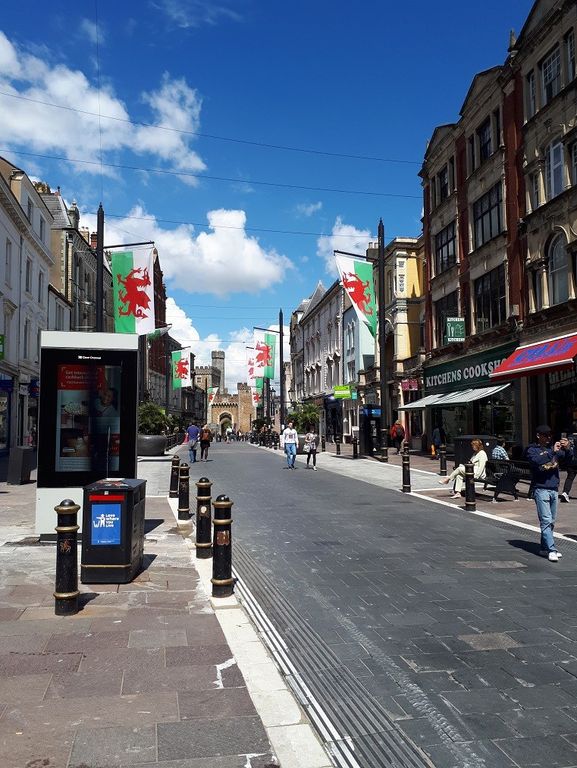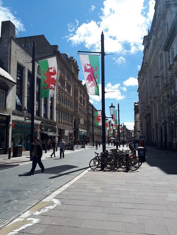 Il centro città è pedonale, si sviluppa su due grandi vie. Le bandiere gallesi sventolano ovunque con il drago rosso, l'orgoglio del popolo locale è davvero una caratteristica di cui resterete affascinati. In centro troverete la chiesa con la torre dell'orologio, con a fianco il Market, mercato locale di alimentari ed artigianato, ottimo per fare una spesa tipica. Poco distante il grande centro commerciale John Lewis, 4 piani compreso un parcheggio enorme e un minigolf tropicale. Qui se avete delle esigenze le troverete soddisfatte, compreso medicinali. In città è pieno di botteghe artigiane, dove poter fare uno shopping tradizionale, a volte anche in strada con casette tipo mercatini natalizi nella zona del monumento a Bachelor, sulla cui testa i gabbiani amano sostare. Basta muoversi a piedi, Cardiff è davvero un fazzoletto di città.