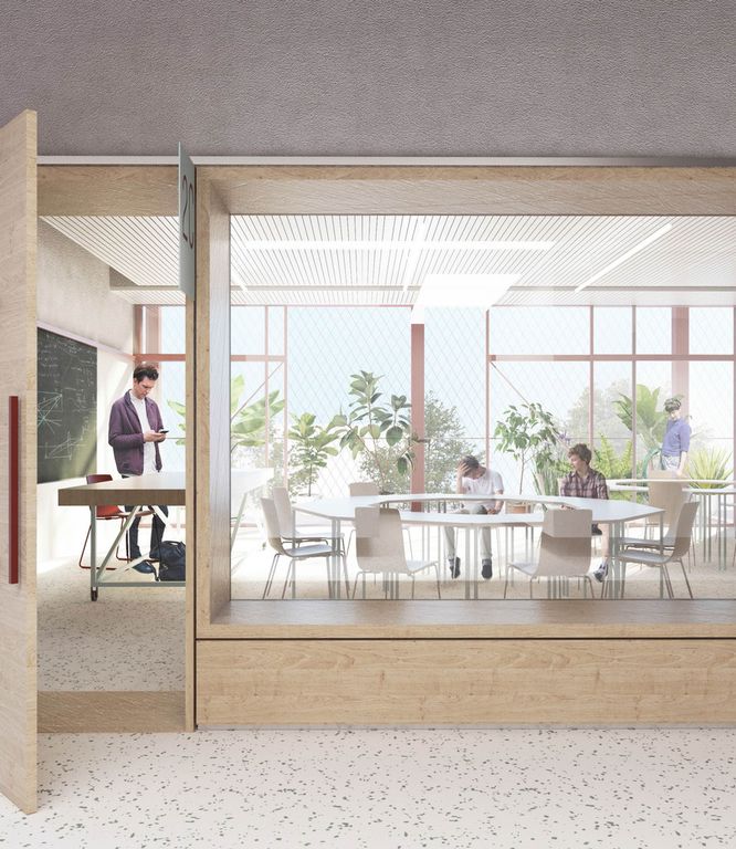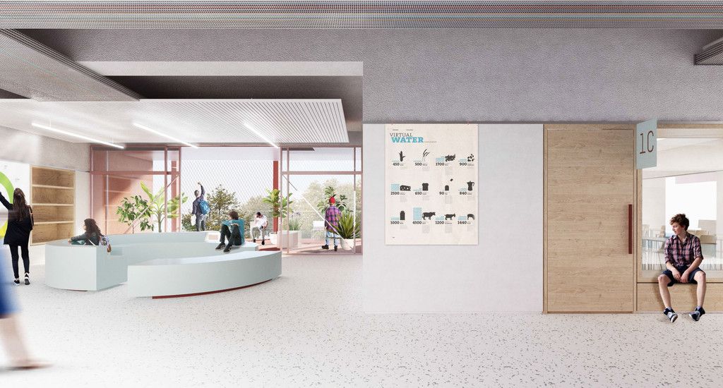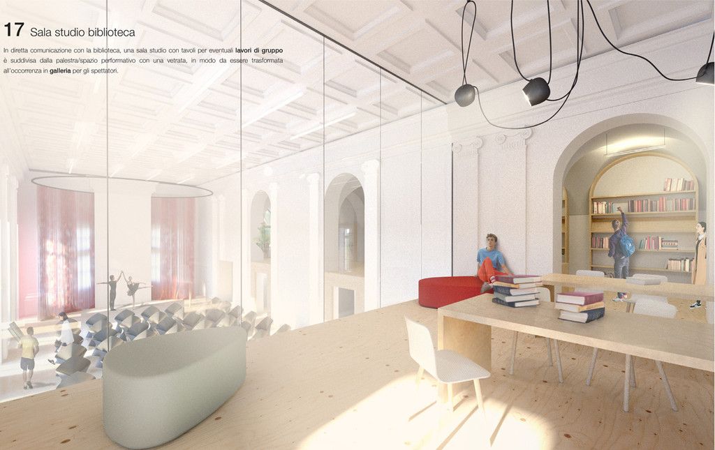 La configurazione spaziale proposta accoglie molti dei temi e dei desideri emersi dal lavoro istruttorio partecipato alla base del concorso. Lo spostamento dell’ingresso esistente permette la creazione di un nuovo foyer capace di essere al contempo atrio, spazio relax per gli studenti e luogo di comunicazione con la città, diventando così un vero centro civico. Il concetto di biblioteca diffusa anima gli spazi di relazione tra i diversi piani; la palestra, con l’addizione di una sala studio vetrata che può fungere da balconata, si dona come flessibile spazio multiuso. La creazione di una terrazza verde sul tetto risarcisce l’edificio dello spazio en plein air che oggi gli manca e aggiunge un elemento di coscienza ambientale ormai acquisito tra i valori pedagogici contemporanei.