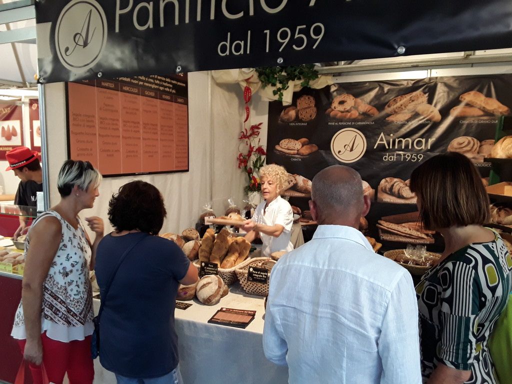 Pane e grissini al peperone sono le proposte dal Panificio Aimar di Carmagnola a Pepero' nella piazza dei Sapori. Il pane al peperone è un impasto molto morbido con all'interno pezzi di peperone crudo, viene cotto nel forno ad una temperatura di 250 gradi per circa 18 minuti.I grissini vengono preparati con farina semi integrale tipo 1, con aggiunta di peperone a piccoli pezzi, cotto per una quindicina di minuti. Il panettone salato viene preparato con lievito madre e arricchito di parmigiano, pecorino romano, pepe bianco, semi di cumino.