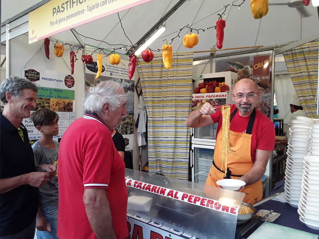 Una collaborazione tra tre aziende: ristorante, pastificio, agri-macelleria sotto il nome di pastificio Profeta di Carmagnola che propone a Peperò presso la piazza dei Sapori i tajarin con crema al peperone e gli agnolottini del plin al sugo di arrosto.
