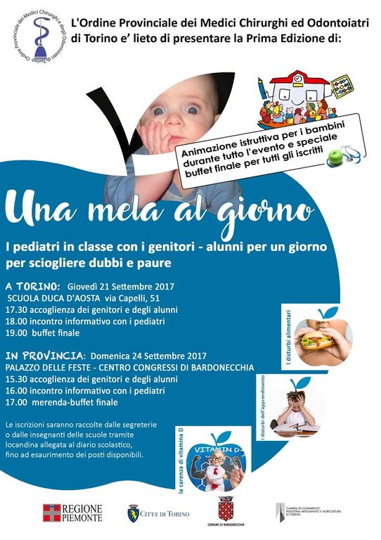 L'Ordine Provinciale dei Medici Chirurghi e Odontoiatri di Torino presenta Una mela al giorno, evento informativo destinato ai genitori degli studenti di scuole primarie. Due le tappe previste: a Torino, giuovedì 21 settembre, presso la scuola Duca d'Aosta in via Capelli 51, alle 17:30 e a Bardonecchia, domenica 24 settembre, al Palazzo delle feste, presso il Centro Congressi, alle 15:30.