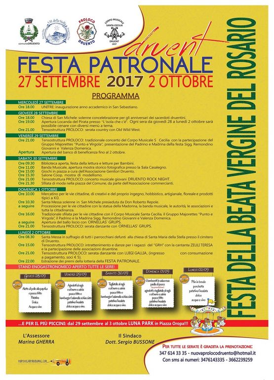 Stand enogastronomico aperto tutte le sere con diversi menù a tema, gradita la prenotazione: 3476143335 - nuovaprolocodruento@hotmail.it