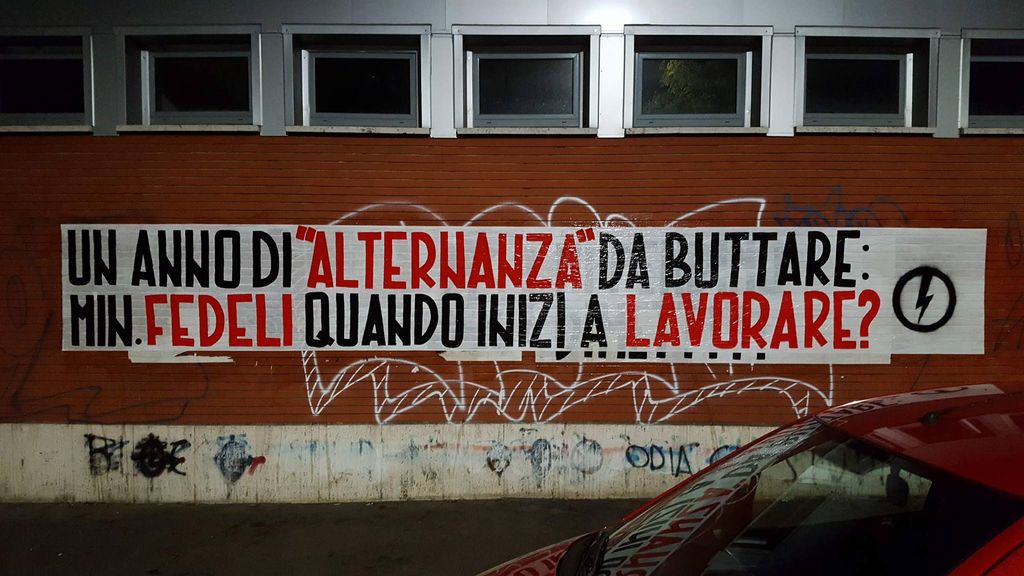 “Un anno di alternanza da buttare: Ministro Fedeli quando inizi a lavorare?” è il testo dello striscione affisso nelle scorse ore dal Blocco Studentesco per evidenziare i pessimi risultati dell’esperimento didattico-lavorativo condotto a partire dalla “Buona Scuola” renziana.