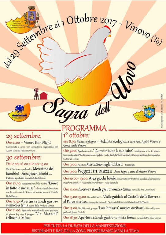 Dal 29 settembre al 1° ottobre il Comune di Vinovo organizza la Sagra dell’uovo.