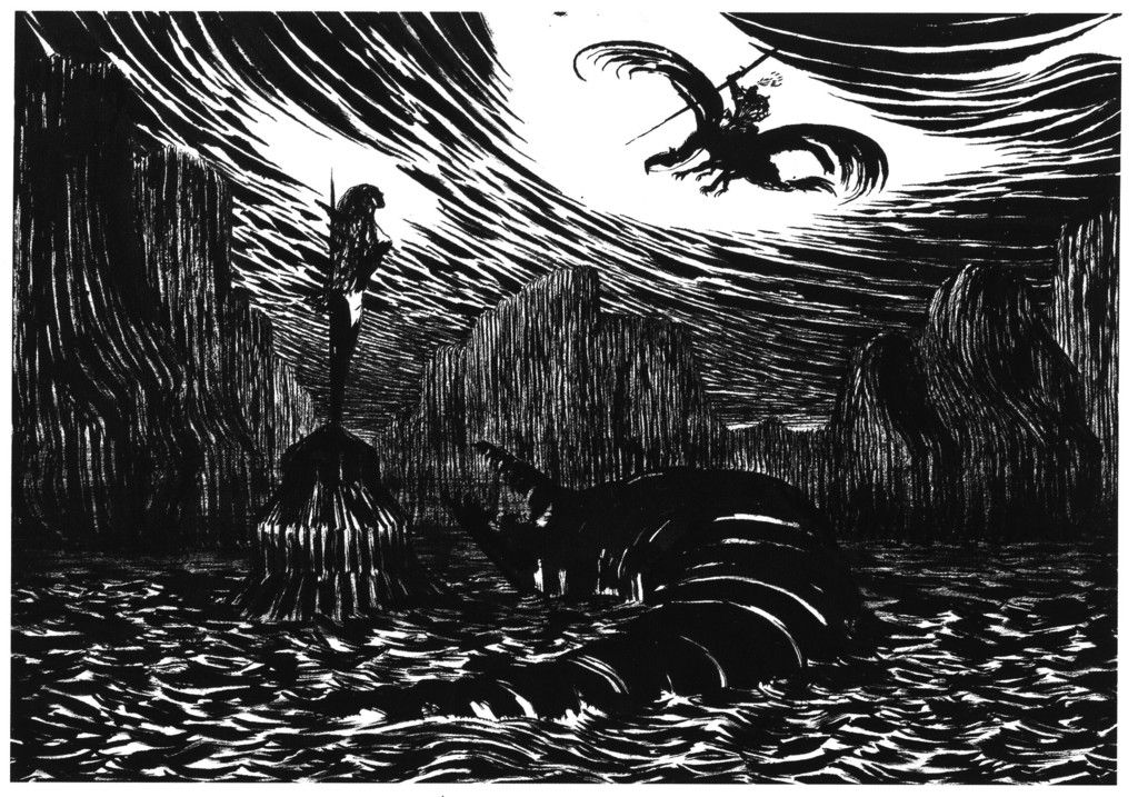 Conclude la mostra la sezione dedicata all’ultimo sforzo creativo di Mattotti durato ben dieci anni Ghirlanda, dove i disegni in bianco e nero dell’illustratore si uniscono ai testi di Jerry Kramsky (già scrittore del testo del “Mistero delle Antiche Creature e da sempre sodale dell’Artista). Con queste immagini, morbide e suggestive Mattotti ci regala un universo allegorico in cui ha ritrovato l’antico piacere di disegnare. Completamente eseguite a china le tavole di Ghirlanda emergono dai taccuini di schizzi che Mattotti realizza dall’inizio della sua carriera e che denotano un’evoluzione artistica leggera, giocosa, vitale e piena di senso del meraviglioso.