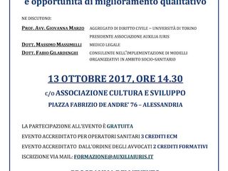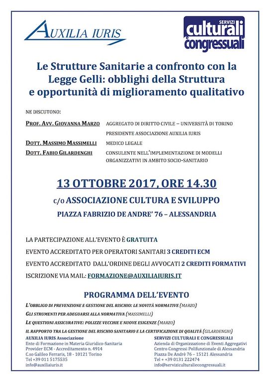 L'iniziativa è organizzata da Servizi Culturali e Congressuali, partner logistico dell’Associazione Cultura e Sviluppo di Alessandria, in partnership con l’Associazione Auxilia Iuris il convegno ECM “Le Strutture Sanitarie a confronto con la Legge Gelli: obblighi della Struttura e opportunità di miglioramento qualitativo”.