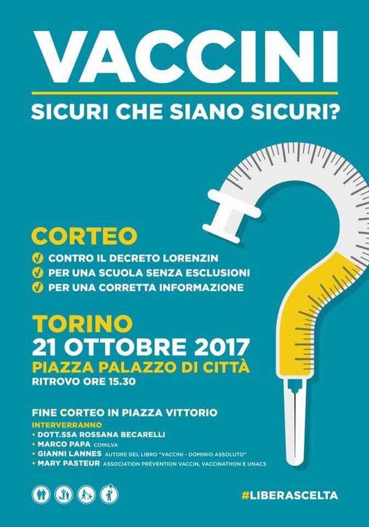 A Torino nuova mobilitazione contro il decreto del Ministro della Salute Beatrice Lorenzin, che ha portato il numero di vaccinazioni obbligatorie nell'infanzia e nell'adolescenza nel nostro Paese da quattro a dieci.