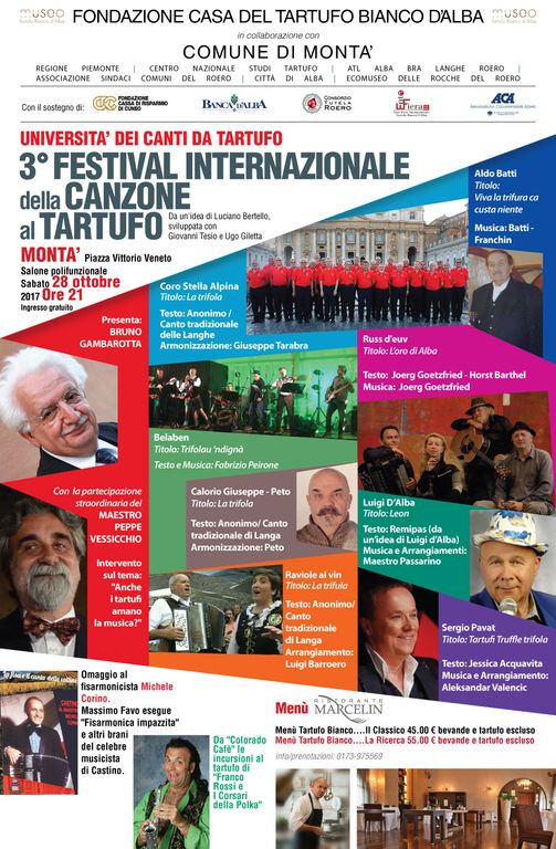 Fervono i preparativi per la terza edizione del Festival Internazionale della Canzone al Tartufo, che si terrà a Montà d’Alba in provincia di Cuneo il prossimo sabato 28 ottobre. Presentata sempre da Bruno Gambarotta, scrittore dai noti interessi enogastronomici, e con la prestigiosa presenza in giuria del maestro Peppe Vessicchio, la manifestazione, nata da un’idea di Luciano Bertello, sviluppata con Ugo Giletta e Giovanni Tesio, intende richiamare l’attenzione su un aspetto poco noto della storia del tartufo, e cioè la sua presenza nelle canzoni popolari dei cantastorie di Langhe-Roero e Monferrato. Il tartufo fa parte della storia del territorio, è protagonista di leggende e racconti popolari, è stato raccontato e interpretato da scrittori e pittori, da poeti e vignettisti. Mitizzato per i suoi presunti contenuti afrodisiaci, ha un posto privilegiato nella cultura popolare ed in particolare nelle canzoni, nelle “cunte” dei cantastorie di Langhe-Roero e Monferrato: dal grande Ugo ‘d Verdun, fino agli ultimi cantastorie di Langa ovvero il Brav’om di Prunetto e Luigi Barroero di Belvedere Langhe. Anche per questa edizione è confermata la presenza di cantanti in gara e gruppi da altre regioni tartuficole d’Europa, in linea con il carattere internazionale della manifestazione. Confermato anche il legame con il Festival della canzone di Sanremo con la presenza del maestro Peppe Vessicchio, ospite d’onore e autore di un intervento che permetterà di scoprire se “anche i tartufi amano la musica?”. Oltre ai cantanti in gara, lo spettacolo sarà impreziosito dalle incursioni comiche al tartufo di Franco Rossi e i Corsari della Polca. L’appuntamento è per sabato 28 ottobre dalle 20.30, nel Salone Polifunzionale in Piazza Vittorio Veneto a Montà, in provincia di Cuneo, con ingresso libero fino ad esaurimento dei posti. Per l'occasione, il Ristorante Marcelin di Montà proporrà una cena tematica con due menù, classico e ricerca, dedicati ovviamente al tartufo bianco, per prenotazioni telefonare al 0173.975569