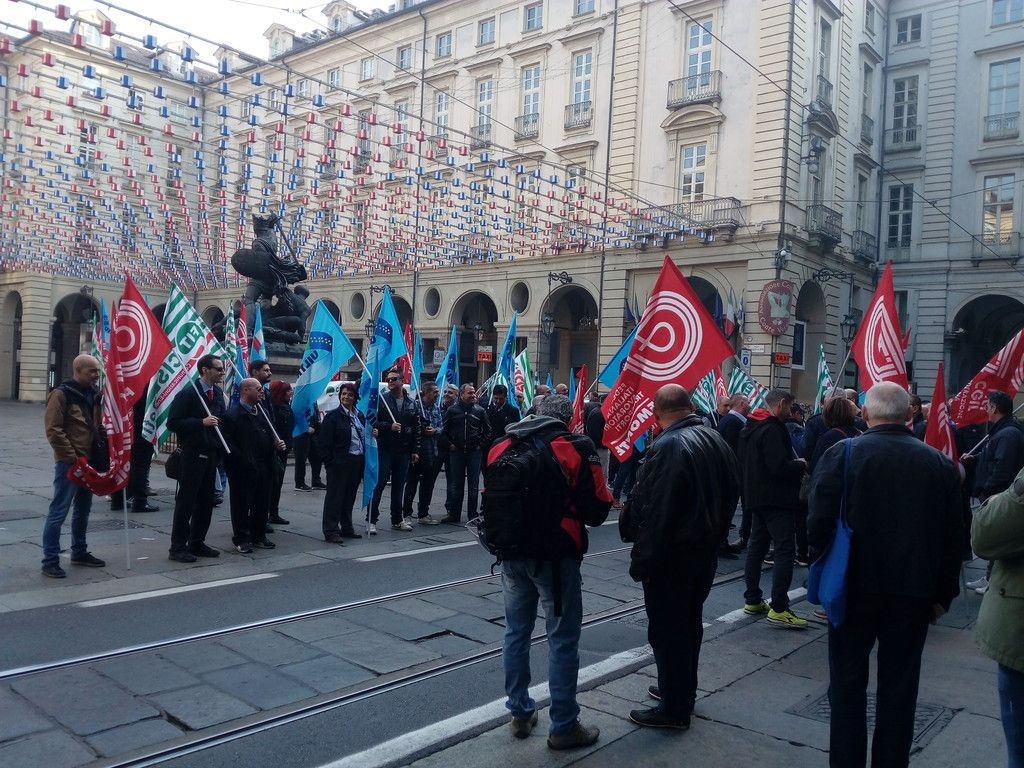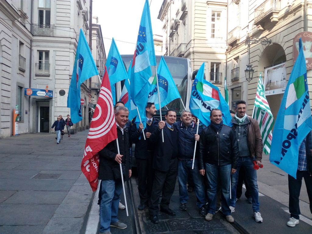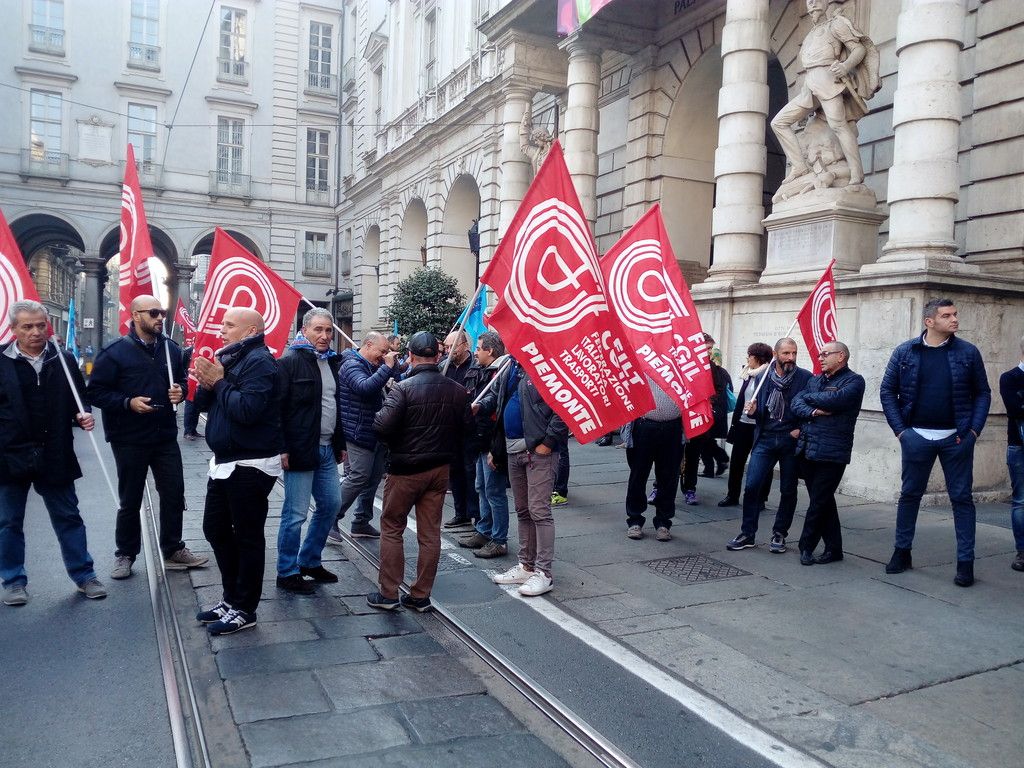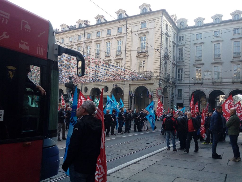 Al grido di "Vergogna, vergogna" una sessantina di dipendenti Gtt, che hanno aderito allo sciopero di 4 ore proclamato da Filt Cgil, Filt Cisl e Uil Trasporti, dal primo pomeriggio stanno manifestando sotto il comune di Torino.