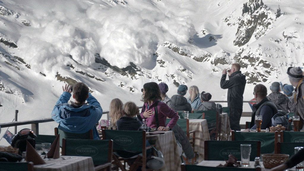 In Forza maggiore (Svezia, 2014, 118’) una famiglia svedese si reca sulle Alpi francesi per godersi un paio di giorni di vacanza e di sci. Il sole splende sulle spettacolari piste, ma durante una colazione sul terrazzo del resort alpino, una slavina travolge ogni cosa. I commensali fuggono in tutte le direzioni, anche Tomas, il capofamiglia, preso dal panico, scappa assorbito dalla confusione e nebulosità del nevischio, abbandonando la moglie ed entrambi i figli. La slavina si ferma in tempo prima che l’incidente si trasformi in tragedia, ma è invece troppo tardi per la tragedia che si insinua nei rapporti tra Tomas, la moglie e i loro figli.