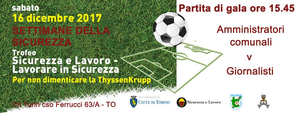 Nel pomeriggio di sabato 16 dicembre 2017, dalle ore 14 alle 18, l’impianto sportivo Cit Turin Lde, in corso Ferrucci 63/A a Torino, ospiterà il tradizionale “Trofeo di calcio Sicurezza e Lavoro - Lavorare in sicurezza”. La “partita di gala” si giocherà alle ore 15.45: la squadra di calcio degli Amministratori comunali sfiderà una selezione di Giornalisti torinesi in una partita di calcio a 8 (due tempi da 25 minuti) a scopo benefico.