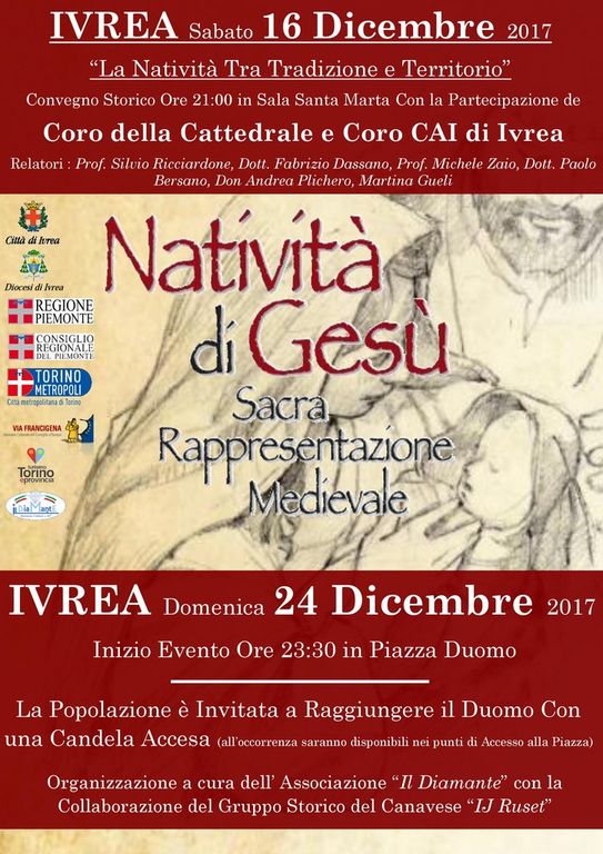 Con il Patrocinio della Diocesi e della Città di Ivrea, della Regione e della Presidenza del Consiglio Regionale del Piemonte, della Città Metropolitana di Torino e dell' Associazione Europea delle Vie Francigene (EAVF) e dell' ente Turismo Torino e Provincia, l'Associazione Artistico Culturale "Il Diamante" è lieta di comunicare che Sabato 24 Dicembre 2017 avrà luogo ad Ivrea la seconda edizione della Sacra Rappresentazione Medievale della natività di Gesù sotto la Direzione Artistica del poliedrico attore canavesano Davide Mindo.