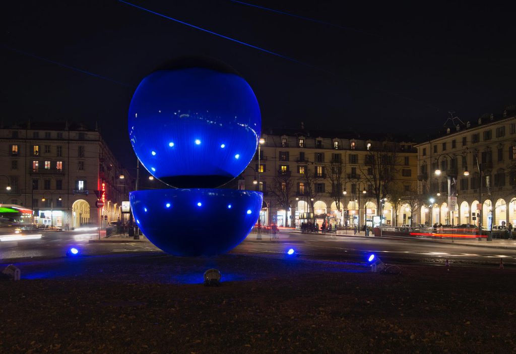 L'opera di Armando Testa, una sfera e una mezza sfera di acciaio nero di circa 5 metri di altezza, sarà illuminata con luci colorate, come a colori è il linguaggio della comunicazione attuale. Saranno luci sempre in movimento, curiose, si faranno vedere da tutti, proprio come insegna da sempre il meccanismo pubblicitario, del quale Armando era profondo conoscitore.
