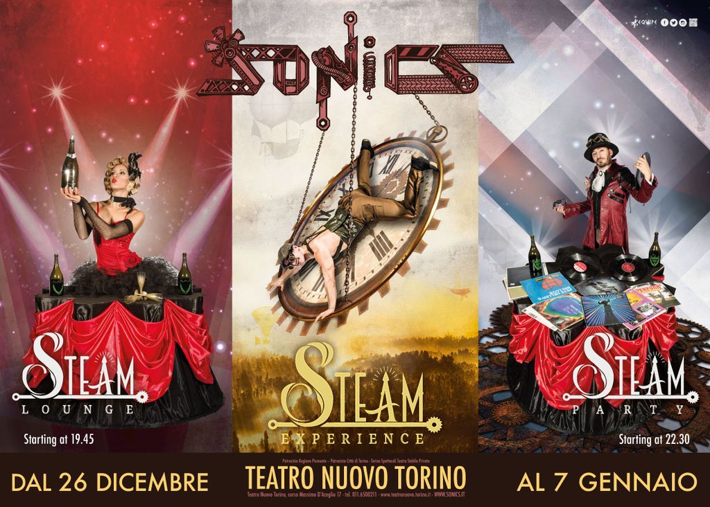La corrente artistica e iconografica Steampunk ha ispirato l'ultimo progetto Sonics, declinata in una cifra stilistica particolare e unica. “Steam” è frutto di un lavoro di ricerca sul campo e di creazione collettiva. Tutto lo staff creativo Sonics - composto da artisti, costumisti, ligh designer, grafici e videomaker – ha compiuto un viaggio a piccoli gruppi a Londra, città patria dello SteamPunk, alla scoperta di oggetti e luoghi che potessero ispirare costumi, personaggi e oggetti di scena.