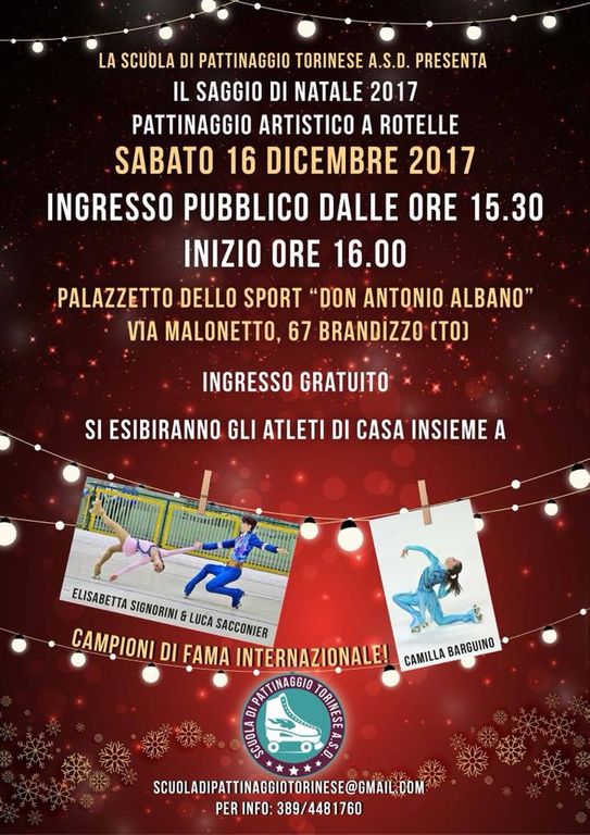 Sabato 16 dicembre alle ore 16 presso il Palazzetto dello Sport "Don Antonio Albano" di Brandizzo si è svolto il Saggio di Natale 2017 di pattinaggio artistico a rotelle organizzato dalla Scuola di Pattinaggio Torinese di Brandizzo.