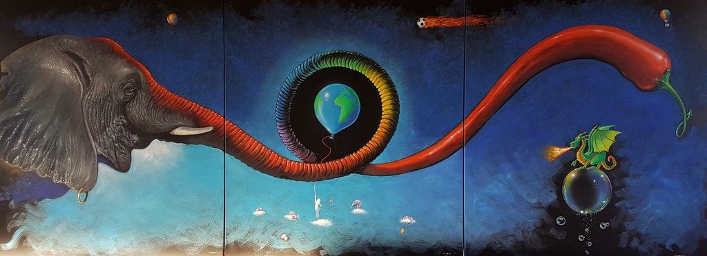 L'opera, intitolata "Fire", è un trittico pittorico su lamiera, in cui viene rappresentato un animale maestoso come l'elefante, abbinando, da un punto di vista iconografico, un omaggio al locale, punto di ritrovo importante di Campidoglio, alla denuncia della dissennata caccia a scopo di lucro di cui è vittima questo imponente mammifero, che rischia di causarne l'estinzione.