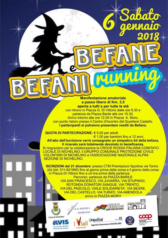 La competizione non agonistica è aperta a tutti: chi vorrà potrà presentarsi vestito da Befana. La quota di partecipazione è di 5 euro per gli adulti e di un euro per i bimbi fino a 12 anni. In piazza Di Vittorio ci sarà stamani il ritrovo dalle 9.30. I partecipanti riceveranno un simpatico kit della befana. Il ricavato sarà devoluto in beneficienza per l’acquisto di giocattoli per i bambini delle famiglie nichelinesi in difficoltà.