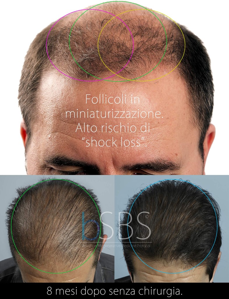 Un altro nemico da tener conto è l’effetto “shock-loss” dei follicoli nativi, ovvero i follicoli presenti nella zona diradata accanto ai quali vengono posizionati quelli trapiantati. Questi follicoli, solitamente più sottili e non sani, non resistono al trauma dovuto all’innesto e possono andare incontro ad una caduta accelerata. Il risultato di tutto questo è che dopo un tempo relativamente breve, l’effetto estetico non sarà quello iniziale e sarà da ripetere l’intervento.