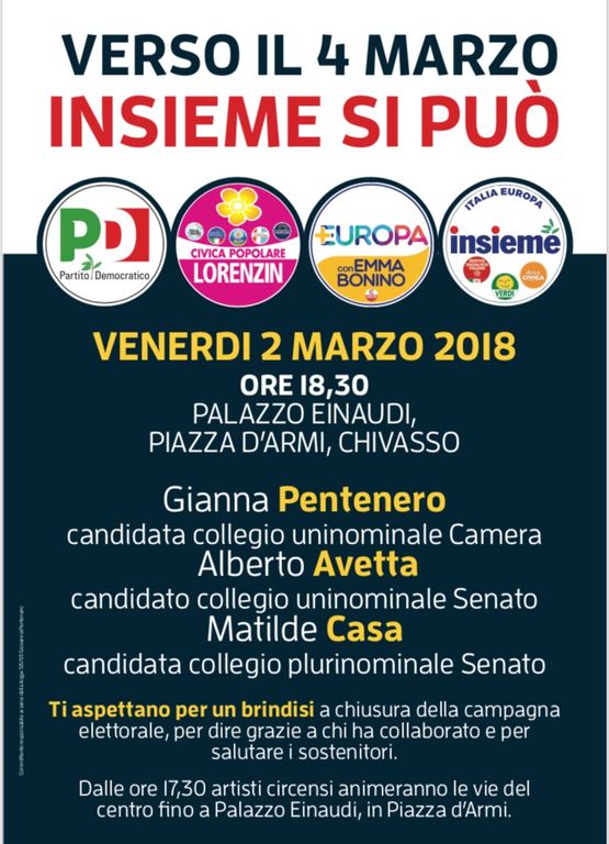 E' in programma la serata di chiusura della campagna elettorale di Gianna Pentenero (Collegio Uninominale Camera dei Deputati), Alberto Avetta (Collegio Uninominale, Senato della Repubblica) e Matilde Casa (Collegio Plurinominale Senato della Repubblica).