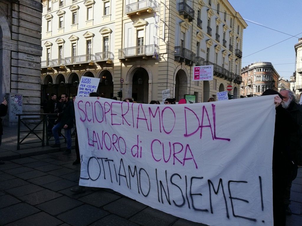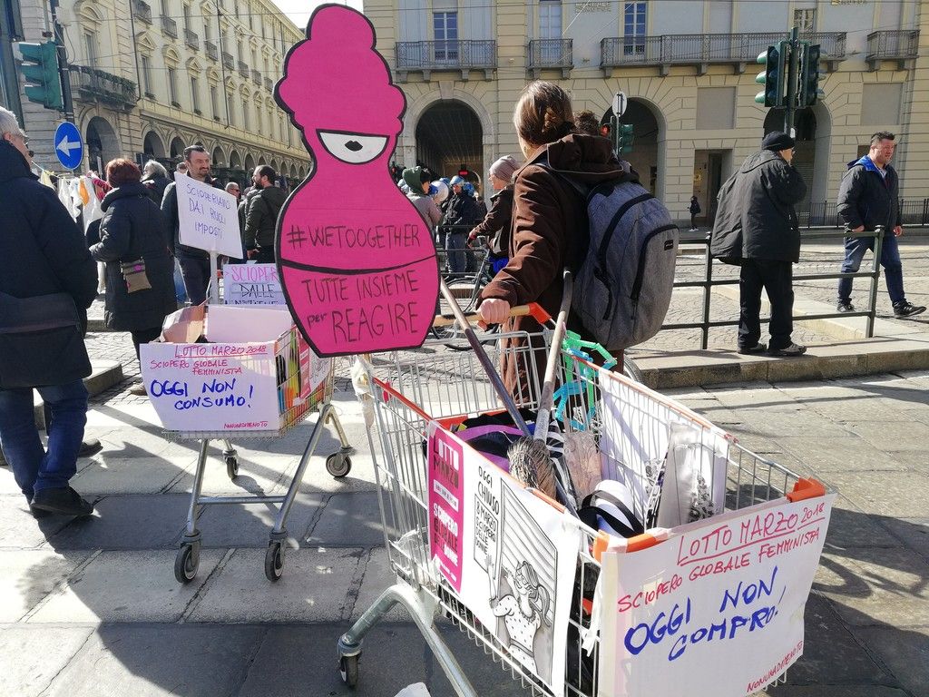 Traffico bloccato in piazza Castello da carrelli della spesa e bucato: anche a Torino lo sciopero femminista globale (FOTO e VIDEO)