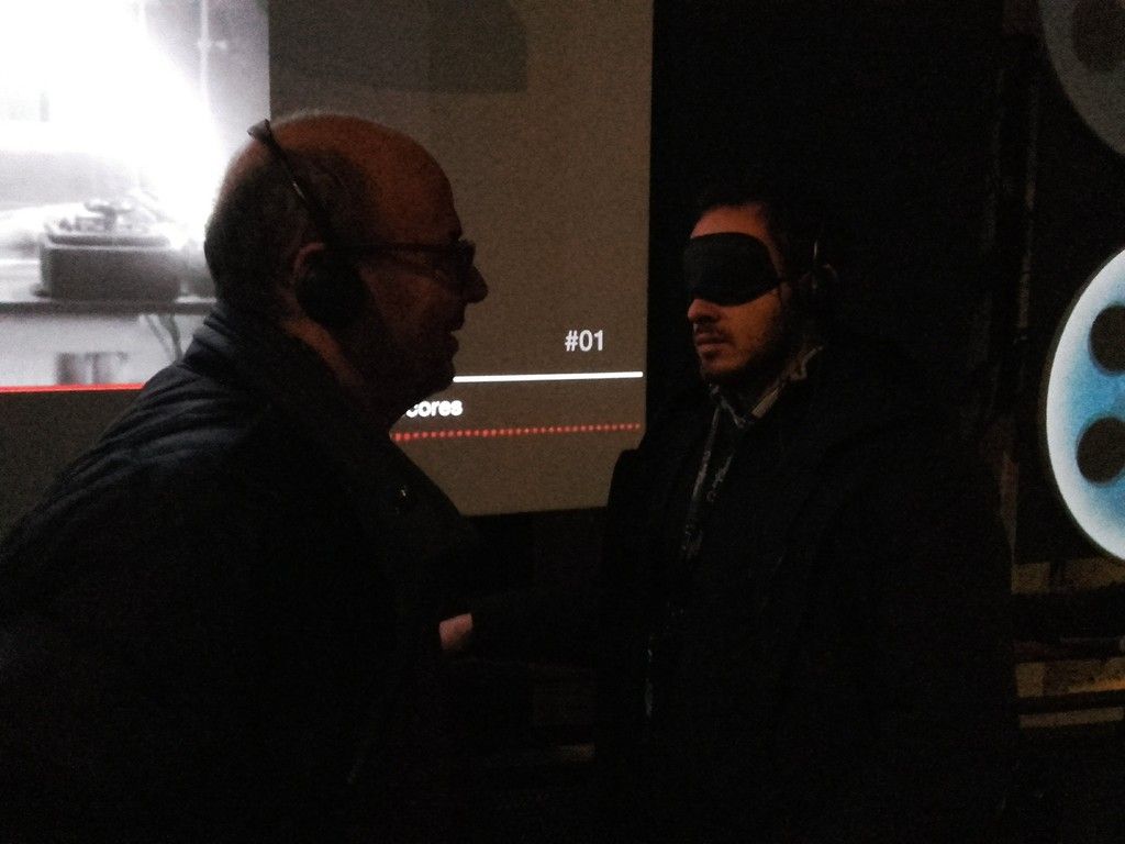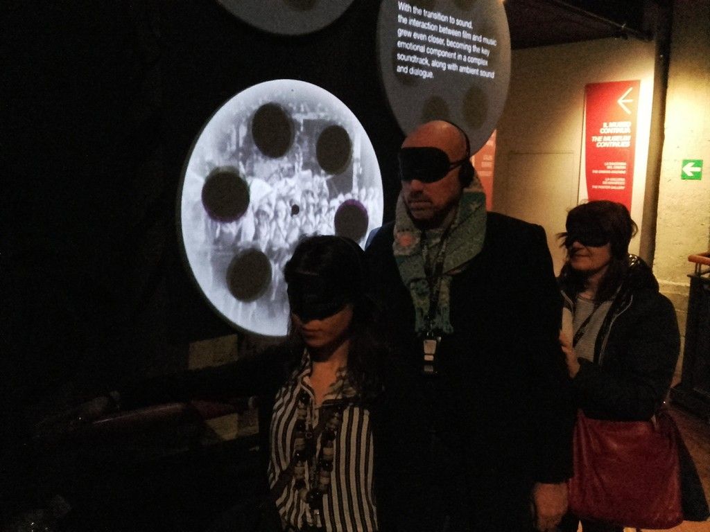 Bendati e con le cuffie alle orecchie ci si arrampica per la Galleria del museo, la rampa che sale a spirale lungo le mura perimetrali. Ci si muove in fila indiana, in piccoli gruppi e a piccoli passi, tenendo stretto il corrimano. Mentre la guida racconta la storia del cinema, ci si abitua alla nuova condizione cercando nuovi punti di riferimento, come il profumo fruttato o il fruscio della giacca appartenente alla persona che occupa il posto davanti in fila.