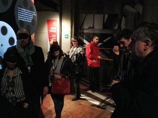 Bendati e con le cuffie alle orecchie ci si arrampica per la Galleria del museo, la rampa che sale a spirale lungo le mura perimetrali. Ci si muove in fila indiana, in piccoli gruppi e a piccoli passi, tenendo stretto il corrimano. Mentre la guida racconta la storia del cinema, ci si abitua alla nuova condizione cercando nuovi punti di riferimento, come il profumo fruttato o il fruscio della giacca appartenente alla persona che occupa il posto davanti in fila.
