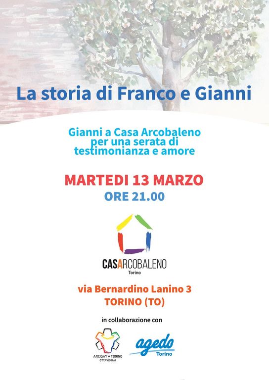 Domani sera a CasArcobaleno, alle ore 21, ci sarà la presentazione del libro "La storia di Franco e Gianni", a loro dedicato. Lottando per ottenere ciò che desideravano, essere cittadini di serie A, loro che sono sempre stati comunque una famiglia. Un percorso che ha inizio nel lontano 1964, nella Torino bene, in una calda sera d’estate a casa di amici. A quei tempi, ancor più che oggi, la vita per gli omosessuali non era affatto facile. Non c’erano ritrovi, locali o discoteche e nell’ambito gay ci si incontrava prevalentemente nelle case di amici.