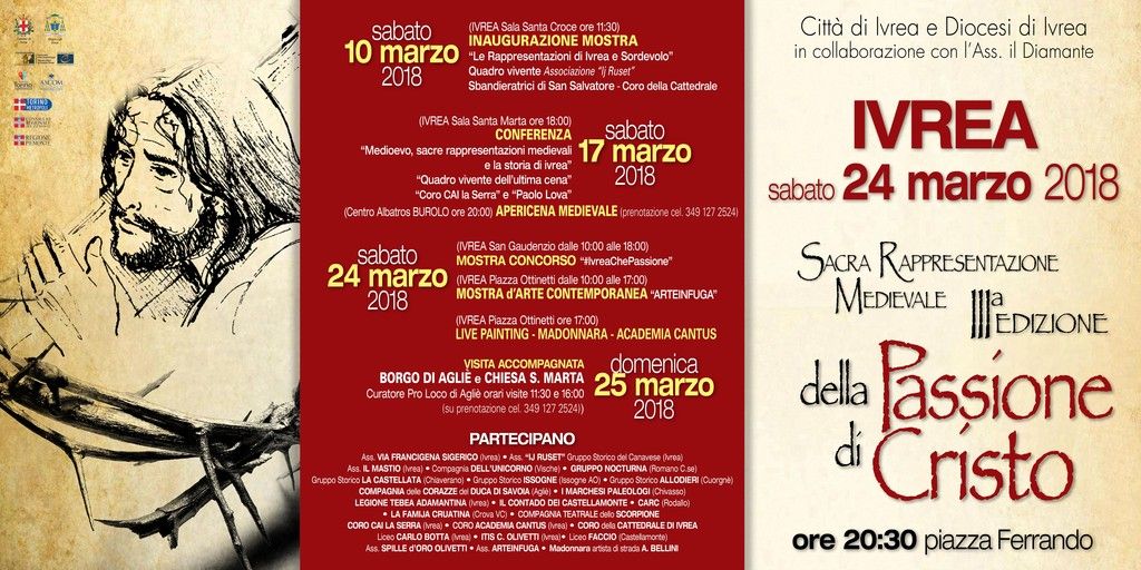 La Rappresentazione teatrale itinerante che si terrà ad Ivrea il 24 Marzo alle ore 20.30 a partire da Piazza Ferrando e si svilupperà nelle vie del centro cittadino sino in Piazza castello per la crocefissione del Cristo con la suggestione del castello dalle rosse torri.