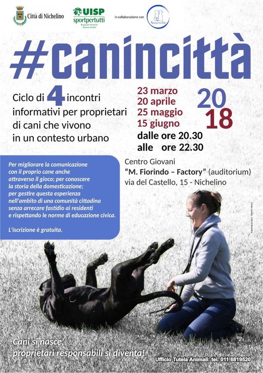 Organizzati da Comune e UISP (Comitato Regionale Piemonte – Attività Cinofile) e con la collaborazione dell'Asd “Ami.co - Amici per la coda”, gli appuntamenti verranno ospitati nel Centro Giovani “M. Fiorindo – Factory” (auditorium) – via Del Castello, 15 (Nichelino), dalle ore 20.30 alle ore 22.30.
