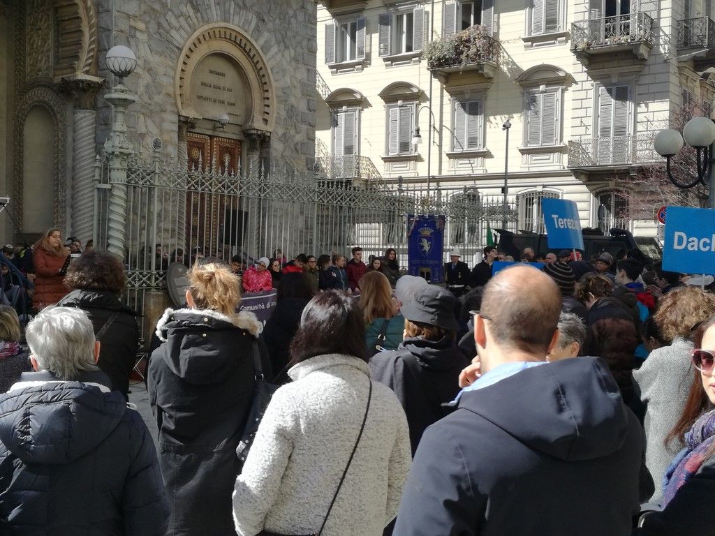 Musica, testimonianze e racconti a 80 anni dall'emanazione delle Leggi Razziali. Tanti i bambini, con un cartello "Non c'è futuro senza memoria"