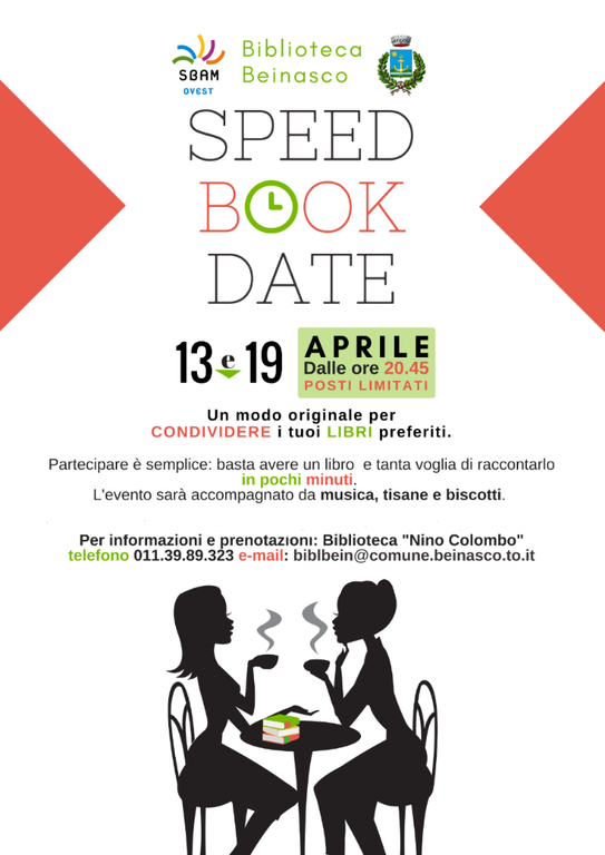 “Abbiamo scelto di trovare un modo molto originale per condividere la passione per i libri, conoscere nuove persone e stare insieme attraverso la cultura – spiegano le assessore del Comune di Beinasco, Antonella Gualchi ed Elena Lumetta – Con lo Speed Book Date, Beinasco rilancia il proprio impegno a sostegno della lettura e si avvicina idealmente al Salone del Libro di Torino, in programma dal 10 al 14 maggio. Come comune capofila del circuito delle biblioteche civiche SBAM, abbiamo scelto di accogliere la sollecitazione del direttore Nicola Lagioia e del vicedirettore Marco Pautasso che hanno scelto di avvicinare il Salone proprio alle biblioteche civiche”.