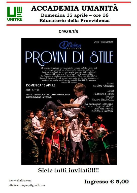 Domenica 15 aprile, per il ciclo di incontri organizzati dall’Unitre Torino per i suoi soci, si terrà lo spettacolo teatrale “Provini di Stile”. Diretto da Matteo Chenna, andrà in scena alle ore 16 sul palco del Teatro dell’Educatorio della Provvidenza in Via Govone 16 a Torino.