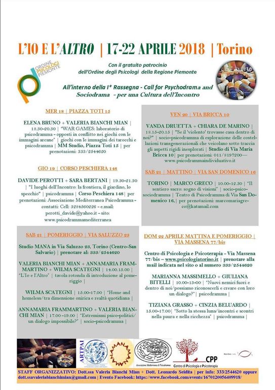 L'evento è patrocinato dagli Ordini del Piemonte, della Lombardia e della Sicilia e comprende, oltre a tantissime attività psico-sociodrammatiche, un convegno a Bagheria (PA), dal titolo "Lo Straniero e l'Ombra - Alle origini delle xenofobie", che vede la presenza, tra gli altri, di Girolamo Lo Verso e Filippo Pergola, e una tavola rotonda a Torino con l'intervento di Wilma Scategni.