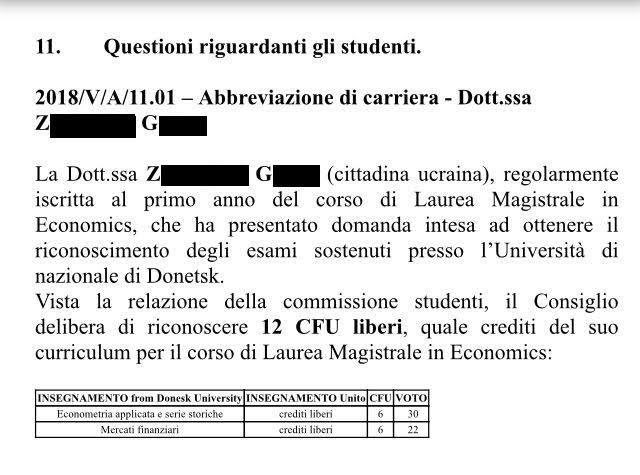 Il Consiglio di Dipartimento di Economia dell’Università degli Studi di Torino ha approvato il riconoscimento di due esami sostenuti nell’Università Nazionale della Repubblica Popolare di Donetsk da una studentessa originaria di Makeyevka (DNR), classe 1991, iscrittasi l’anno scorso all’Ateneo torinese.