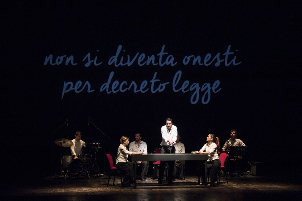 Lo spettacolo è parte integrante de Il palcoscenico della legalità, progetto nazionale ideato e coordinato da The Co2 Crisis Opportunity Onlus, coprodotto da Teatro di Roma, Teatro Stabile di Napoli, Emilia Romagna Teatro e Fondazione Teatro Ragazzi e Giovani Onlus. In scena: Daria D’Aloia, Vincenzo d’Amato, Tania Garribba, Valentina Minzoni, Alessio Vassallo, con i musicisti Tommaso Di Giulio alle chitarre e Paolo Volpini alla batteria.