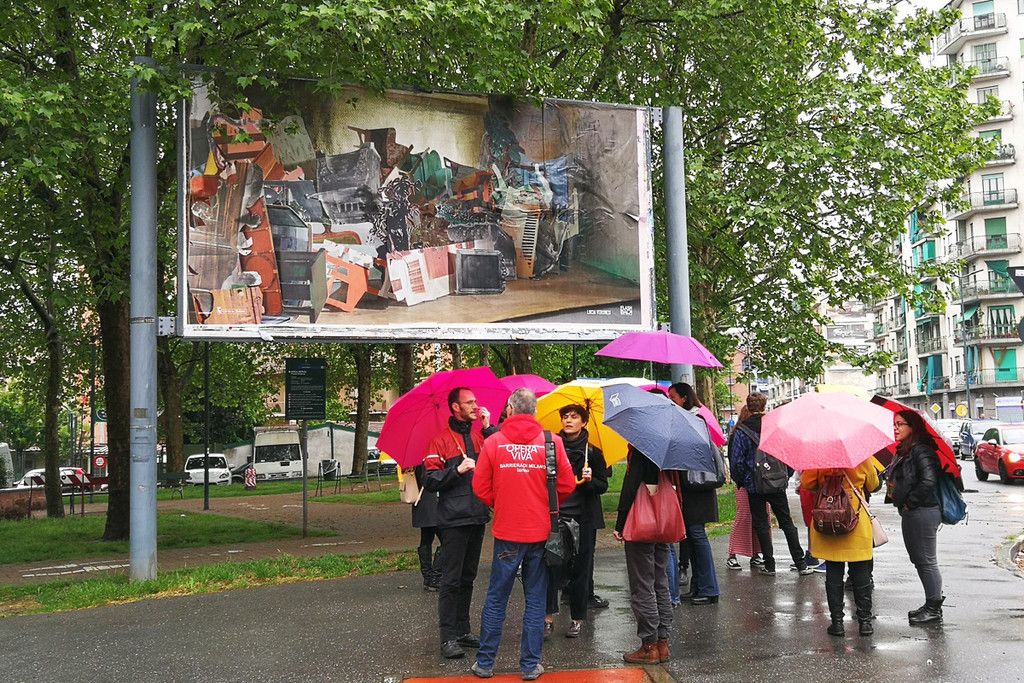 Sotto la pioggia ha preso il via il nuovo ciclo di installazioni nell’ambito di “Opera Viva” in Barriera di Milano, progetto ideato dall’artista Alessandro Bulgini che è sostenuto dalla fiera Flashback. È “La zona sicura” di Lucia Veronesi, artista veneziana, a inaugurare l’edizione 2018 della rassegna, con un’opera di 3 metri per 6 che ora campeggia in piazza Bottesini, dove resterà per quattro settimane. Poi toccherà a un altro artista, per concludere poi, da inizio ottobre a inizio novembre, con un’opera di Alessandro Bulgini. In totale tre artisti, quindi, selezionati grazie alla curatela di Christian Caliandro, ma a breve ne saranno scelti altri tre.