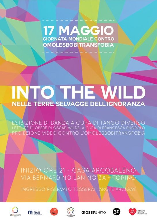 A conclusione della giornata, alle 21.00 presso CasArcobaleno, via Bernardino Lanino 3/a, M.A.I.S. Ong e Arcigay Torino, in collaborazione con Altera Cultura, Giosef Unito e Trepuntozero, con il supporto di No Hate Speech Movement, organizzano Into the Wild(e): nelle terre selvagge dell'ignoranza. Le associazioni hanno scelto di celebrare questa ricorrenza con il consueto mix di impegno ed ironia, dedicando un evento alla figura di Oscar Wilde, da un lato artista ed esteta acclamato e imitato dal pubblico, dall'altro omosessuale perseguitato e imprigionato per la sua condotta ritenuta riprovevole. Ad aprire letteralmente le danze il duo Tango Diverso, che si esibisce in uno spettacolo en travesti. A condurci per mano durante la serata è lui, Oscar, per voce di Francesca Puopolo, Presidente di Arcigay Torino; Wilde, testimone perfetto dell'ipocrisia che ci circonda, riabilitato solo nel 2017, dopo oltre 120 anni, a seguito una lettera della regina Elisabetta che sancisce la fine di ogni forma di discriminazione nei confronti dei cittadini del Commonwealth. A conclusione della serata, vengono trasmessi alcuni spezzoni tratti da film e documentari contro l'omofobia. Per partecipare alla serata è necessario essere in possesso della tessera Arcigay o Arci.
