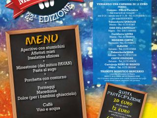Si parte con un Aperitivo con stuzzichini alla prima tappa, procedendo si arriva agli Affettati misti, poi sarà la tappa dell’Insalatina sfiziosa. Non mancherà il Minestrone del mitico Pavan, poi Pasta al sugo, di seguito Porchetta con contorno. Non mancheranno i Formaggi, quindi la Macedonia, il Dolce (per i bambini Ghiacciolo) ed anche il Caffè, Vino e Acqua.